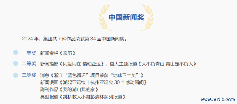 2024年,浙报集团7件作品荣获第34届中国新闻奖,数量创历年新高,其中《亲历》专栏获一等奖。“第一视点”栏目高质量做好习近平新时代中国特色社会主义思想宣传阐释,全力讲好习近平总书记故事、浙江故事,全网传播量超17.85亿。潮新闻客户端每天全网阅读量达3.5亿,成为新时代舆论主阵地。浙江省国际传播中心挂牌成立,推动优质内容加速出海。