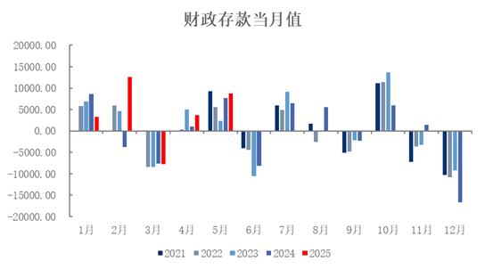 5月M1同比增速较上月提升0.8个百分点至2.3%,这一回升主要受去年同期打击存款手工补息造成的低基数效应影响。M2同比增速小幅放缓0.1个百分点至7.9%,显示整体货币环境仍保持稳健。从存款结构来看,企业存款同比多增3824亿元,非银金融机构存款同比多增300亿元,而居民存款新增4700亿元并同比多增500亿元,反映出居民风险偏好维持低位,仍具备较高储蓄倾向。此外,5月财政存款增加8800亿元,同比多增1167亿元,显示财政资金拨付仍待提速。